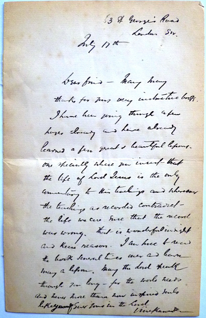 Yours of the 25th June has duly reached and gave me great pleasure. I am so glad to see the noble work progressing. I had learnt with the greatest delight from Mrs. Bull of the work that is going to be done in Cambridge this winter and no better person could have been selected to direct it as yourself. May all power attend you. I will be only too glad to write for the magazine from time to time and my first instalment was to be in a few weeks, when I hope to get some leisure. Certainly it goes without saying that no one of the types we call religious ought to die — they like races require fresh infusion of blood in the form of ideas. It is wonderful to be able to sympathise with others from their standpoints of view.